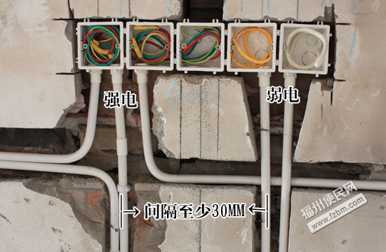 7、强弱电线管平行距离必须分开30公分以上,交叉过桥距不应小于10公分。线管交叉无干扰,强弱电暗盒之间可紧靠,但不允许同盒。