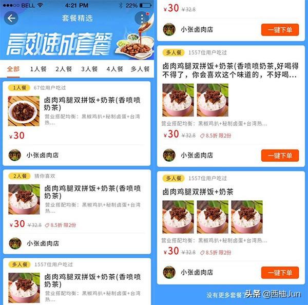 支持组合套餐功能,套餐营销功能,可以在首页突出套餐展示位置,方便用户快速下单,给有选择综合症的小伙伴带来一个福音。同时也可以提高订单的客单价,客单价越高,商家和平台的利润就越高。