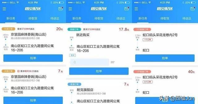 根据用户下达不同类型的订单,悟空跑腿APP上都会有明显的类别显示(订单左上角或订单下方会有外卖订单、普通订单、跑腿订单(帮买、帮送)、调度台指派、调度台改派、预约订单标签)当用户下单后,负责所在区域的配送员刷新悟空跑腿APP即可在新任务界面接单(订单排列顺序按抢单通知下发时间倒序排列)。注意:专人专送订单一单抢单成功,未完成配送前不能再抢其他订单。