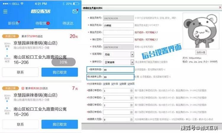 接单专用APP-悟空快跑。主页面分为新任务、待取件、代送达三个进度界面。后台可自由设置配送员的处理订单上限和取消订单数上限,防止配送员盲目抢单导致配送不及时。