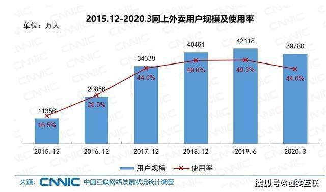 随着移动互联网红利逐渐见顶,各企业的焦虑感也无法掩藏。QuestMobile的数据显示,移动互联网月活跃用户虽然在持续上升,但月活跃用户的增速却一直在下跌。中国互联网络信息中心(CNNIC)发布的第45次《中国互联网络发展状况统计报告》显示,截至2020年3月,我国网上外卖用户规模达3.98亿,占网民整体的44%;手机网上外卖用户规模达3.97亿,占手机网民整体的44.2%。2020年3月,我国网上外卖及手机网上外卖用户规模均小于2018-2019年。